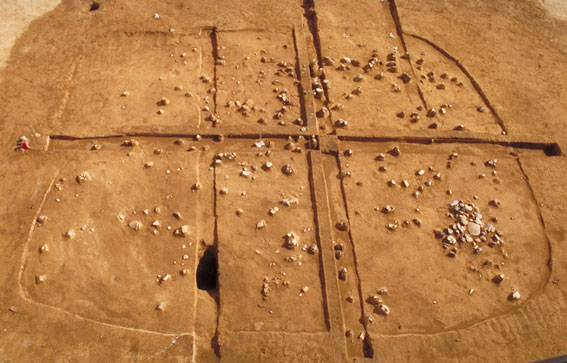 十字のベルトは、土層の堆積状況および住居の壁の立ち上がりを確認するために設定したもの。