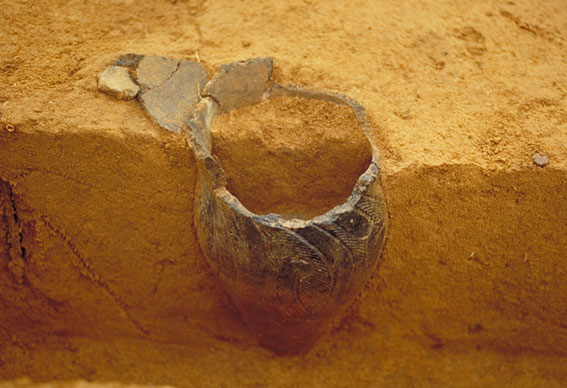 頸部より上部をカットし、正位の状態で検出された、縄文時代後期称名寺式土器。