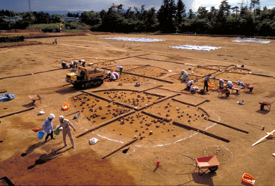 乾燥すると、土の色の違いによる遺構の確認が困難になるため、常に水を撒きながら遺構の確認を行います。