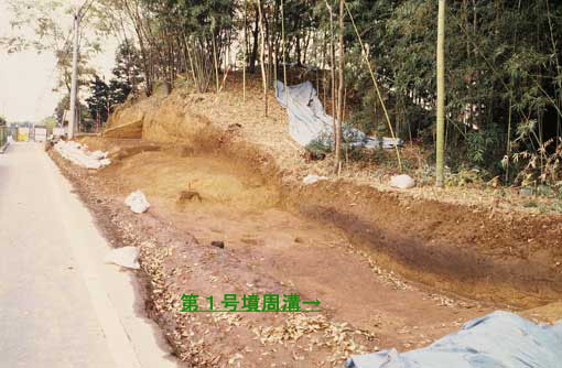 手前に黒色土の堆積がみられる部分が古墳南側の周溝。