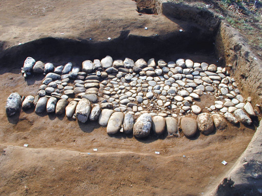 最初に敷いた礫を残し、積み上げた礫を取り除いた状態。玄室部が胴張型の平面形態を呈している状態が良くわかります。