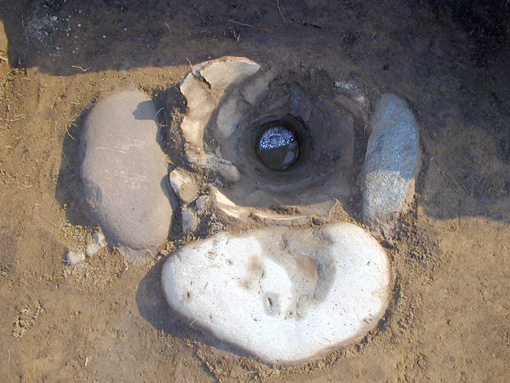 縄文時代中期加曾利E式期の第2号住居跡の石囲埋甕炉です。石囲いの1辺は抜き取られて遺存していませんでした。