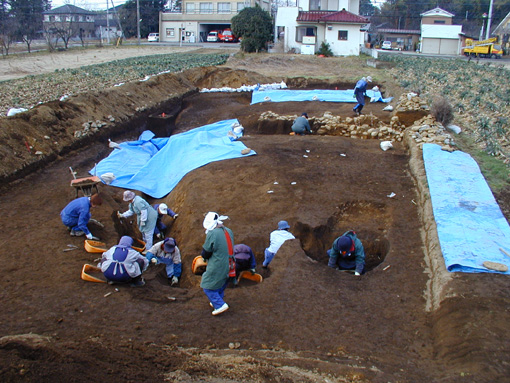 調査区東側に設けた排土山の上から撮影した、調査区全体の調査風景。