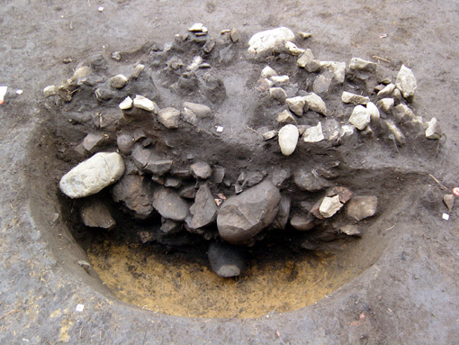 集石土壙を半截した状態です。壙底部まで、びっしり礫が詰まっています。