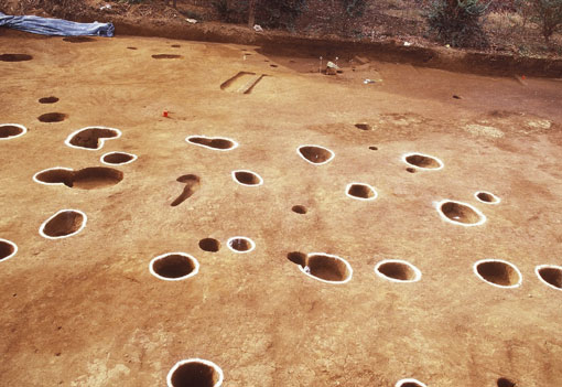 第6号掘立柱建物跡は、南北方向に3×2間。規模は6.75m×4.1m、柱間距離は桁行約2.2m、梁行約2.0mを測る。床面積は27.67u。
