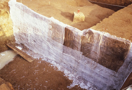 樹脂とガーゼが貼り終わった状態。乾くまで1時間ほど待ち、ガーゼにマジックで、標高ラインとグリットライン、採取場所・日時を書き入れ、カッターで分割して土層面から剥がします。