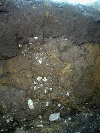 調査終了後、調査区の北側で、生姜を保存するトレンチが掘られていたので調べたところ、墳礫が2箇所確認されました。ローム層を割って下部の礫層が噴出している様子が良くわかります。墳礫は、最上部の黒色土(耕作土層)によって途切れています。