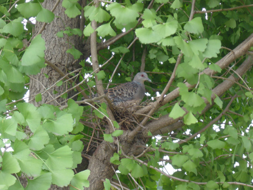 調査区東側境界のイチョウの木で、卵を抱く鳩。
