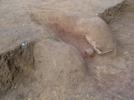 第8号住居跡カマド。カマドの袖の中に土師器の甕が埋め込まれています。