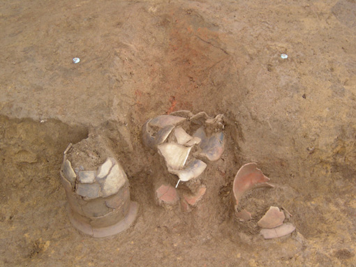 第18号住居跡カマド遺物出土状況。カマドの両袖に構築材として甕が伏せて設置されており、カマド内には甕が潰れた状態で確認されています。