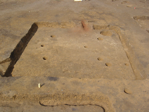 柱穴4本、壁下には溝が巡り、カマドの脇には貯蔵穴が掘られています。