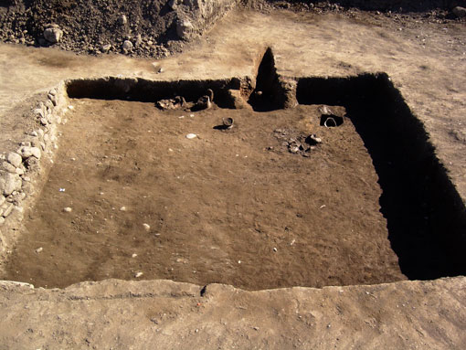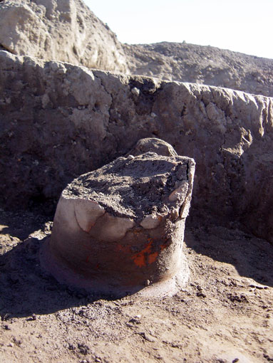 L第2号住居跡遺物出土状況 カマド左袖付近の床面に、逆位で出土した、胴部下半を欠く甕。器台に転用? 2004年2月6日撮影。 |