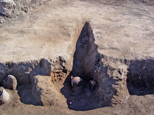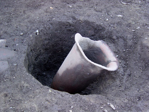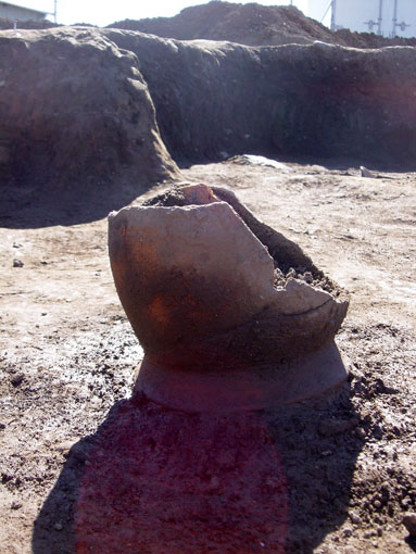 N第2号住居跡遺物出土状況 かまど右側の貯蔵穴の中に立てかけられていたような状態で検出された、ほぼ完形の甕。 2004年2月6日撮影。 |