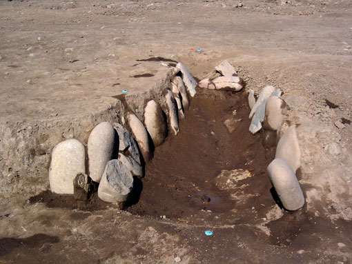 I第1号住居跡カマド カマドは、細長い礫を側面に並べて作られていました。礫が豊富にある荒川沖積地特有のカマドです。 2004年2月6日撮影。 |
