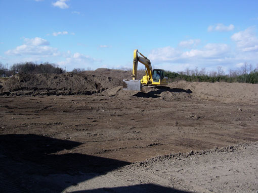 @表土剥 原因者が砂利採取業者なので、重機代は予算化せず、提供していただきました。 砂利の混じらない耕作土は、砂利採取の際にも、先に剥ぐので、発掘調査の表土剥ぎも手馴れたものでした。 風除けのため、剥いだ土は北と西に盛ってもらいました。 2004年1月15日撮影。 |