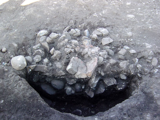 E集石土壙半截 鍋底型の掘り込みの中に、礫が充填されています。壙底部分には多量の炭化粒が確認され、礫は全て被熱し、破損しています。充填されていた礫の総重量は約170kgでした。 2004年1月22日撮影。 |