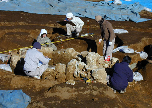 石室石材の傾きや、エレベーション(断面)図は、やはり水糸を張って、メジャーを渡す、従来どおりの手作業での測り込みになります。