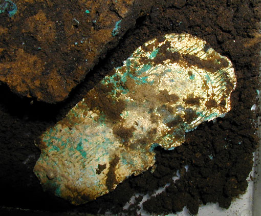 裏面で出土した杏葉を表向きに返した状態。長さ8cm程の銅板に金メッキを施したもので毛彫りで文様が彫られています。埼玉県内では初めて検出されました。