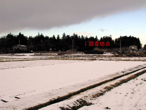 立野遺跡の南側は、和田川の沖積地となっています。前日に降った雪が、田んぼ一面に融けずに残り、空には不気味な雪雲が見えます。