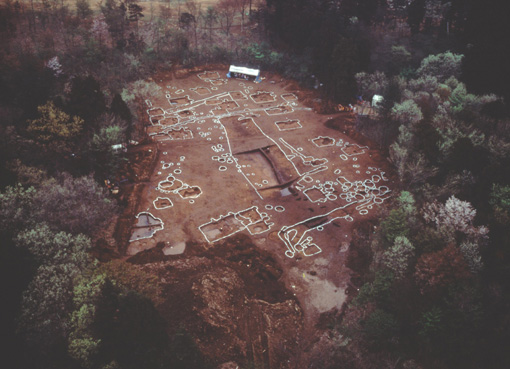 K金堂の東側で確認された集落跡。集落密度は高く。「東院」と墨書された土器が出土しています。また、羽口や鉄滓、銅滓、鉄製鎌などが出土しており、寺を維持管理した人々が住んでいた集落と推定されます。