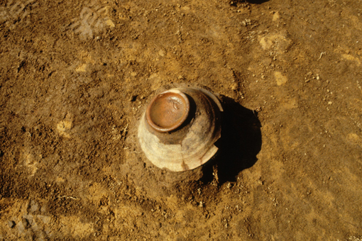 S遺物出土状況。住居跡の床面から、ほぼ完形の坏が出土した状態。