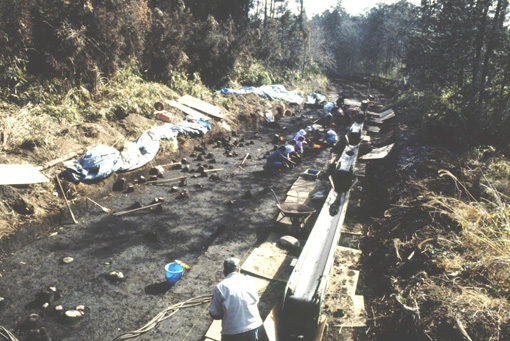 25 中門跡南側の、ゴルフ場外周道路部分の発掘調査風景。この地点になると、埋没谷に移行し、ローム層がのらない、水付の現場となります。