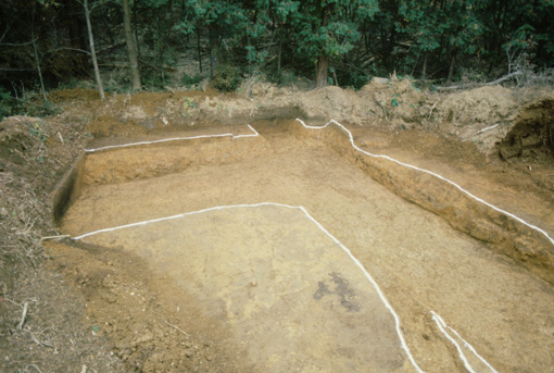 F北西コーナー部寺地区画溝完掘状況。ほぼ垂直に南へ折れています。北辺の溝は、幅、深さを減じて、さらに西方へ延びていることが確認されます。