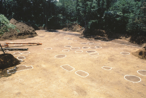 I西辺寺地区画溝の内側に確認された用途不明の円形土壙群。