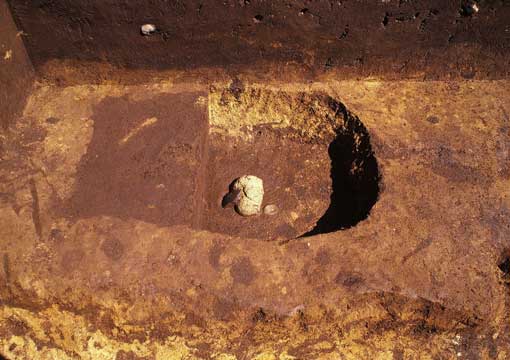 第1号溝の東側で確認され、第2調査地点で確認された第2号溝の間(推定参道部)に位置しています。人が往来する路上に穴など掘らないのが普通ですが、これが対で確認されれば、門跡と推定されます。しかし、残念ながらこのピットの対が存在すると推測される地点は、現道部分にあたり確認することはできませんでした。