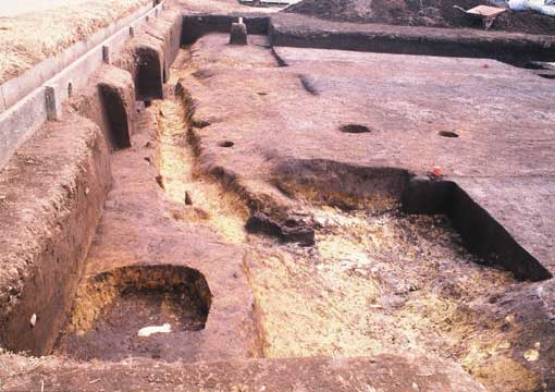 その先の、第1号溝の立ち上がり部分に僅かに杭の頭がのぞいています。