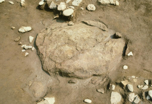 被熱で赤化しています。長さ1.2m、幅0.9m程を測ります。礎石の据付は、基壇の構築途中で掘り、扁平な楕円礫を栗石に敷込んだと考えられます。