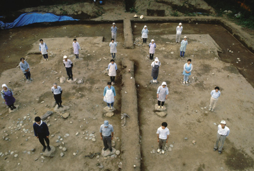 人が建っている場所が礎石が確認された箇所です。お約束の人柱。