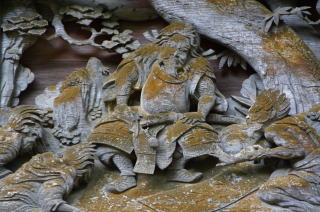 弘化四年(1848)亦八57歳の作品で、欅材による外陣欄間3枚(両面彫刻)と内陣欄間3枚からなり、韓信の股くぐり、鳳凰図(笙を吹く唐子と 簫史:しょうし)、鉄鉢から龍(あごがしゃくれる)を出す陳楠(ちんなん)仙人、麒麟などの彫刻が施されています。