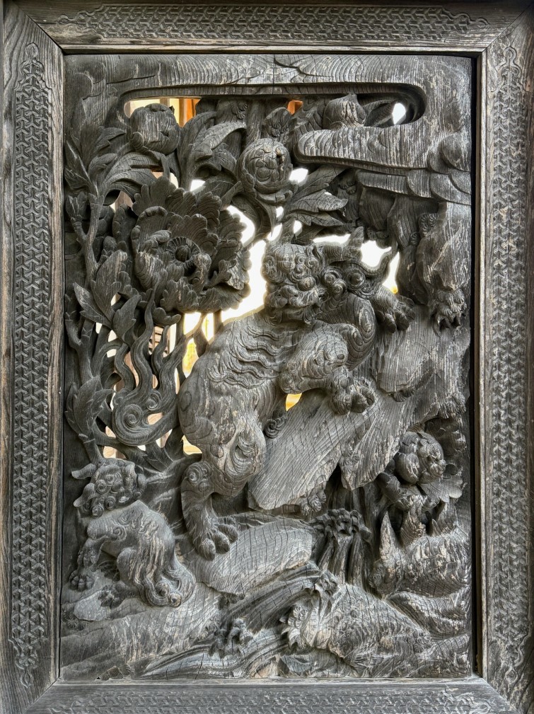 大正2年(1913)歓喜院聖天堂に奉納された「武芸 鼎弘流柔術」の額を彫刻しています。この額は、縦181p×横435pを測る歓喜院最大の奉納額で、額縁は四方彫刻で、上枠は一対の龍、左枠は下り龍、右枠は昇り龍、下枠は唐獅子一対を配して、豪壮で重量感に溢れています。昭和10年頃本庄市仲町山車彫刻、深谷市血洗島諏訪神社本殿脇障子を手掛けています。
