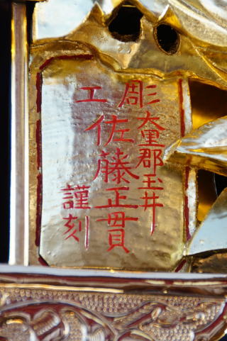 東秩父村大内神社本殿彫刻は、2年がかりで精緻な彫刻を完成させています。胴羽目は、南面が応神天皇誕生、背面が天岩戸、北面が素戔嗚尊の大蛇退治となっています。背面の木札には、「彫工 当国大里郡玉井 佐藤正貫謹刻」と刻まれています。