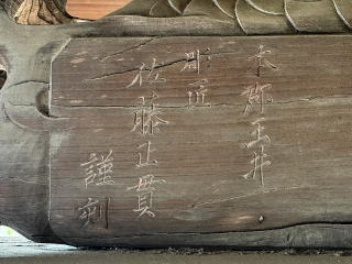 本堂向拝蟇股に龍、木鼻に獅子が彫られています。蟇股の龍の裏には「本郡玉井 彫匠 佐藤正貫 謹刻」と刻まれています。流れるような火焔をまとう木鼻獅子の彫刻は、正貫晩年の作品として見事です。