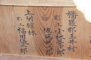 秩父市本町屋台軒支輪の収納箱(1890)には「明治二三年 幡羅郡玉井村彫工 小林栄次郎 同村佐藤熊次郎 銘」と墨書されています。本庄市児玉新町屋台勾欄(1897)には、「彫工 大里郡玉井 佐藤正貫謹刻」と刻まれています。群馬県渋川市真光寺本堂中備の裏には「大正十二年十一月 武州大里郡住佐藤正貫」と墨書、深谷市瑠璃光寺本堂彫刻裏に「本郡玉井 彫匠 佐藤正貫 謹刻」と刻まれています。