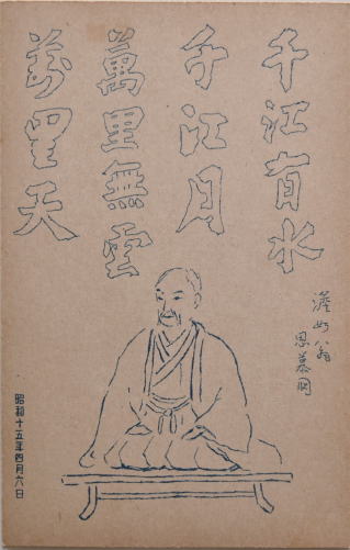 昭和15年発行の絵葉書が残されています。「千江有水千江月 萬里無雲萬里天」と記されており、下部に澹如の肖像が描かれています。原典は不明ですが、掛け軸になっていたものをスケッチしたものと思われます。