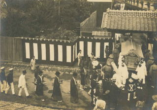 1枚目の写真は、提灯・旗・花を持った白装束の葬列が、白黒の幕がかけられた板塀の脇を通り、瓦葺きの門から邸内に入ろうとしています。