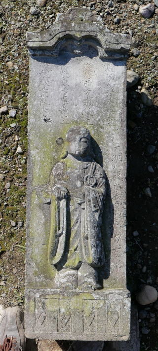 この石仏は、天明8年(1788)に建てられたもので、高さ106p、幅34pを測ります。頭部に笠唐破風を彫り出し、聖徳太子像を半肉彫りしています。上半部と左右に銘文が刻まれています。台座には講中の名前が刻まれています。
