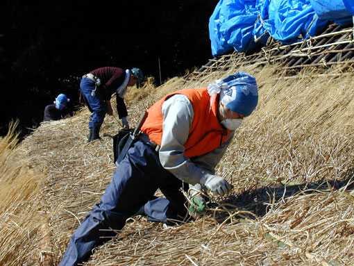平葺きされた茅は、押矛(おしぼこ)と呼ばれる細い竹で押さえ、荒縄で屋根に縛り付けていきます。