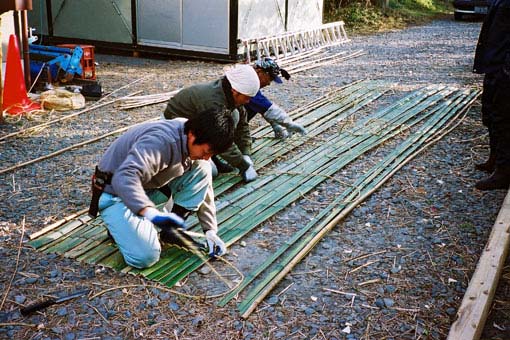 割り竹を並べて荒縄で縛り、棟の上に被せる簀子を作ります。