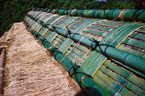 完成した竹簀子。下から見上げるとどうなっているのか中々わからない棟ですが、このような作りになっていました。竹の緑が鮮やかです。
