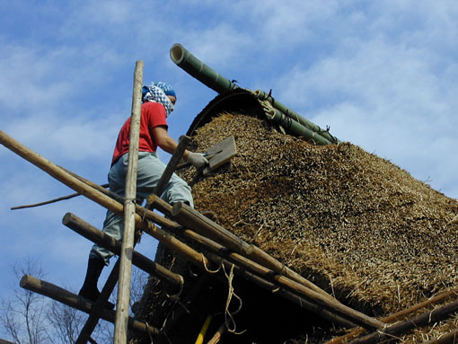 妻面にも専用の足場を組んで、ガギで茅を整えます。