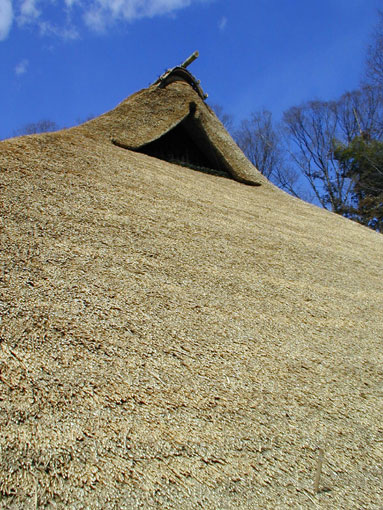 ちょっとわかりづらいのですが、棟の先の陰の部分に、マクラよ呼ばれるU字状に編んだ茅が取り付けられています。