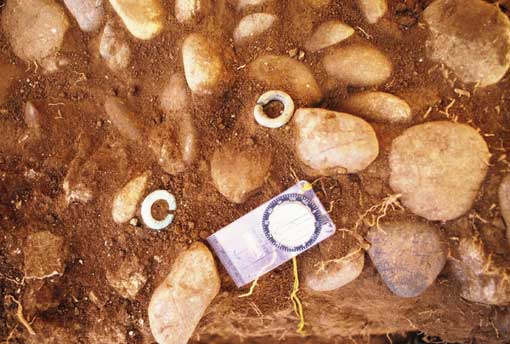 石室内で唯一確認された遺物です。銅製の耳環が1対、舗礫の間から確認されました。