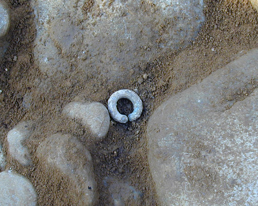 石室のほぼ中央から出土した金銅製の耳環です。1個のみの出土でした。対となっていたならあと一つはどこへ?