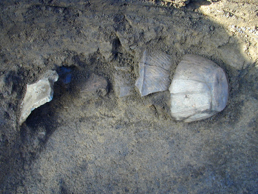 床面直上より出土した縄文土器(加曾利E式土器)の出土状態です。