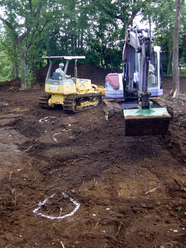 バックホーとブルで表土剥ぎを行います。通常、調査直前に剥ぎますが、今回は、国体がまもなく始まるため、国体終了後すぐに調査に入れるように、前もって表土を剥いでおくことにしました。