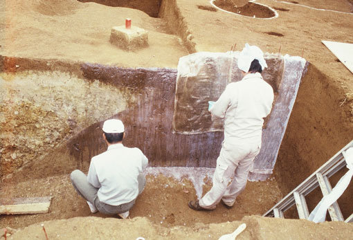 土層面を垂直に落とし、きれいにして、特殊な白色の樹脂をハケで塗ります。そして、その樹脂が固まらないうちに、裏打ちとしてガーゼを貼ります。樹脂は、トマックNS−10というものを使用し、1缶4kg入りで、約2u塗布可能です。
